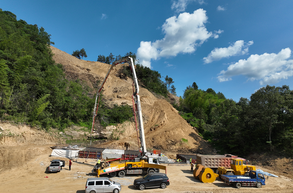 打好現場“攻堅戰”,大干快上搶進度。全線各施工單位迎戰高溫,施工現場吊車、罐車配合,工人揮汗澆筑擋墻立柱。各單位默契配合,克服高溫降雨困難,打好“穿插戰”。橋梁、隧道施工迎難而上,科學攻堅關鍵環節,全力保障施工工效。